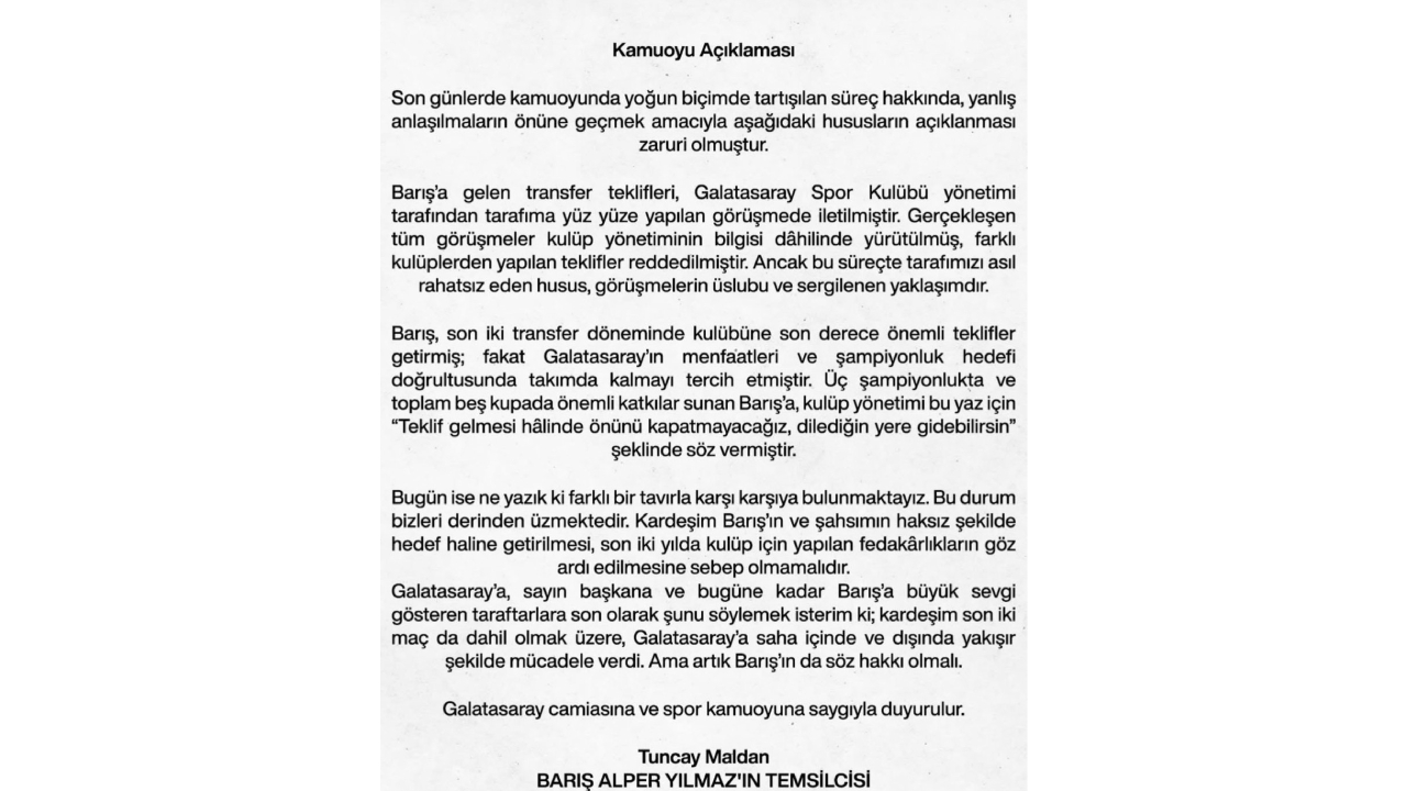 Galatasaray kulübü Neom'a kendilerinden önce oyuncu ile görüşmelerinden dolayı ihtar çekip oyuncuyu salmayacaklarını ifade ederken, Barış Alper Yılmaz'ın menajeri ise oyuncusunun gidişine kolaylık sağlanmasını istedi.