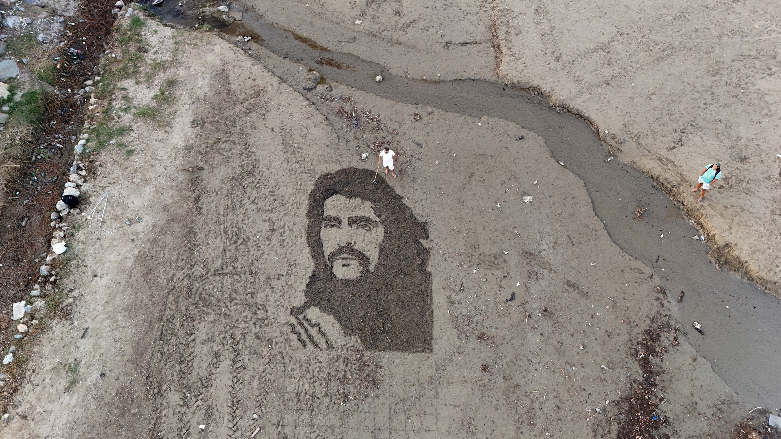 Bagheri daha önce sosyal medyada büyük ilgi gören Müslüm Gürses portresinin ardından Barış Manço’yu sahilde resmetmeye karar verdi. Çalışmasını öğle saatlerinde başlatan sanatçı, gün batımına kadar büyük bir titizlikle detaylarla uğraştı.