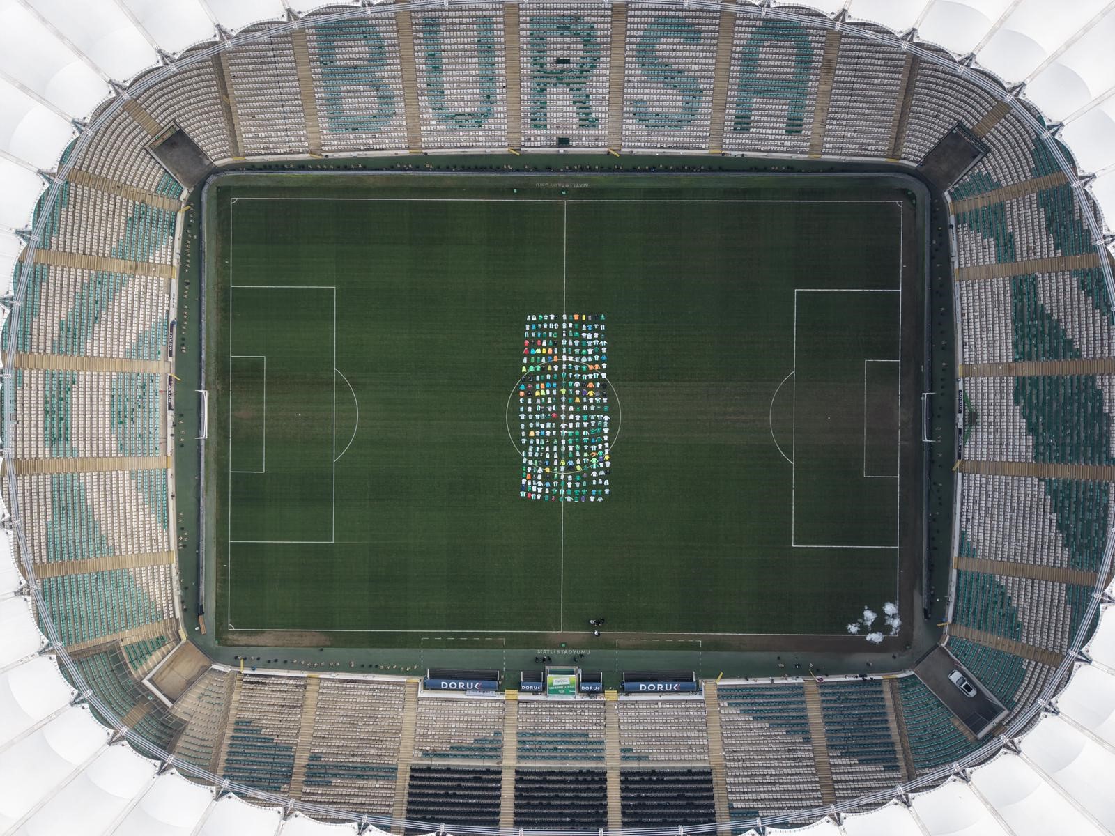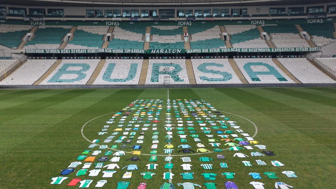 Bursaspor’un maçlarını oynadığı Bursa Atatürk Spor Kompleksi Matlı Stadyumu, bu kez farklı bir organizasyona ev sahipliği yaptı. Stadyumun çim zeminine yerleştirilen yüzlerce forma, havadan çekilen görüntülerle dikkat çekici bir koreografi ortaya koydu. Yeşil-beyaz renklere gönül verenlerin katkısıyla hazırlanan çalışma, kulüp tarihine ve renklere duyulan bağlılığı yansıtan özel bir etkinlik olarak kayda geçti.