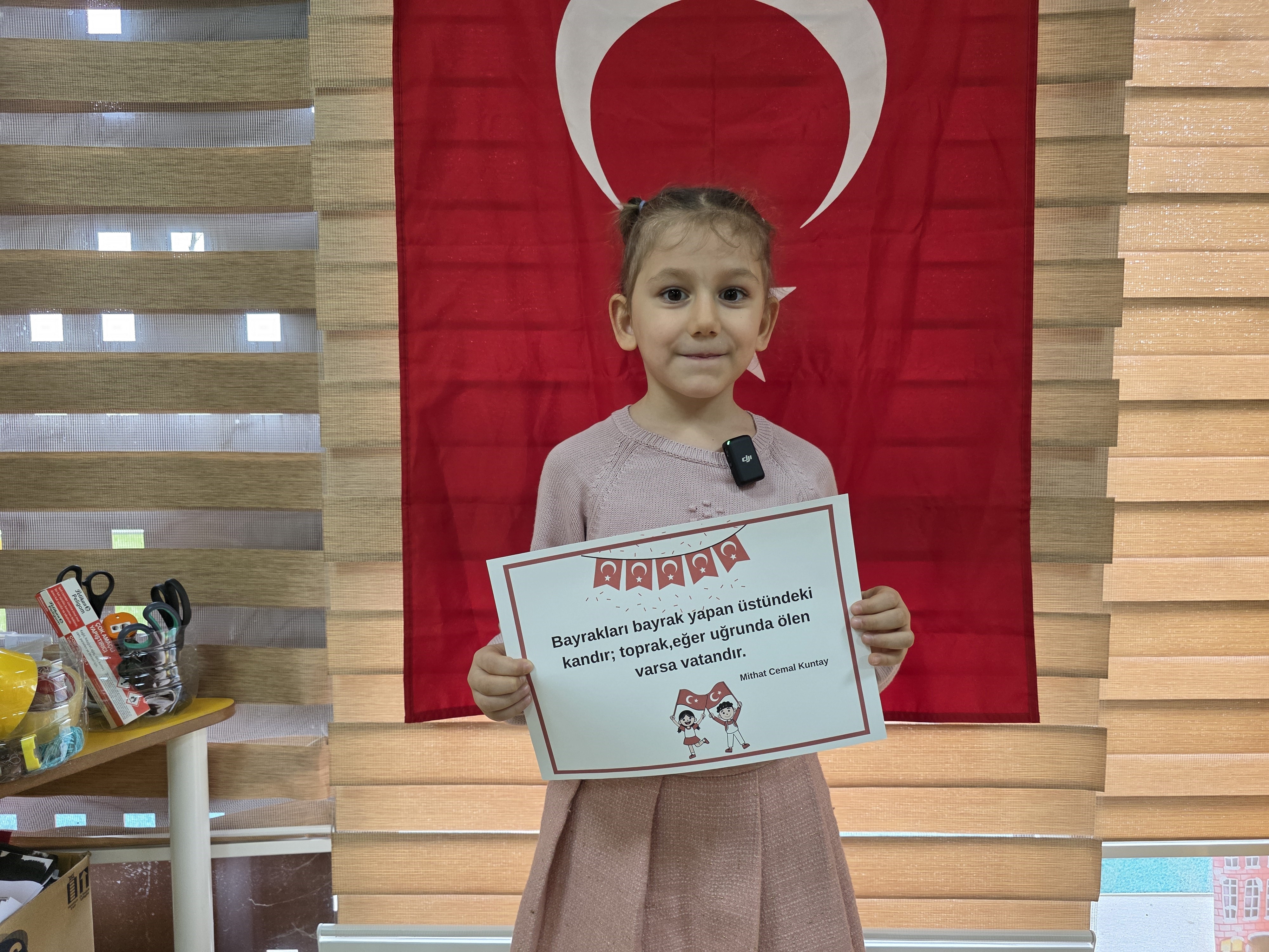 Minik öğrenciler, yapılan deneyler, boyama çalışmaları ve el baskılarıyla Türk bayrağını oluşturdu. Etkinlikler, çocukların Türk bayrağını coşkuyla sallaması ve şiirler okumasıyla sona erdi.