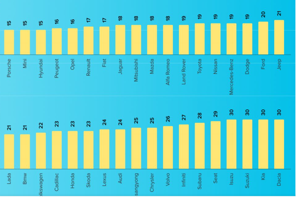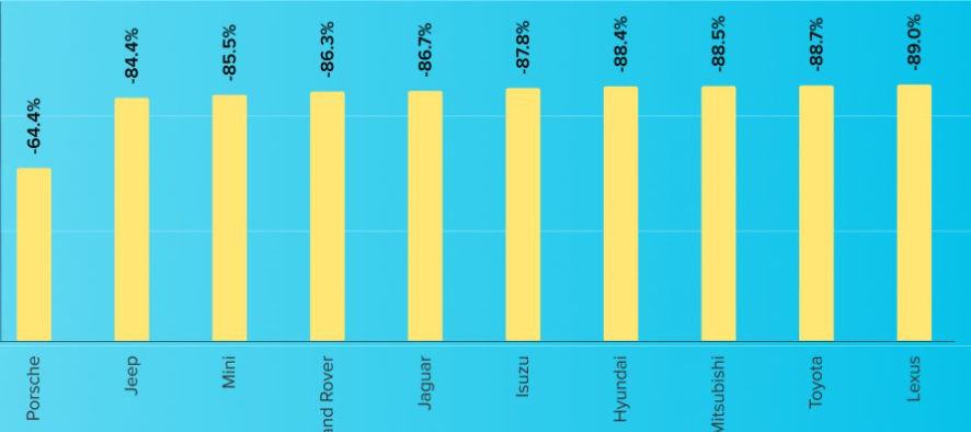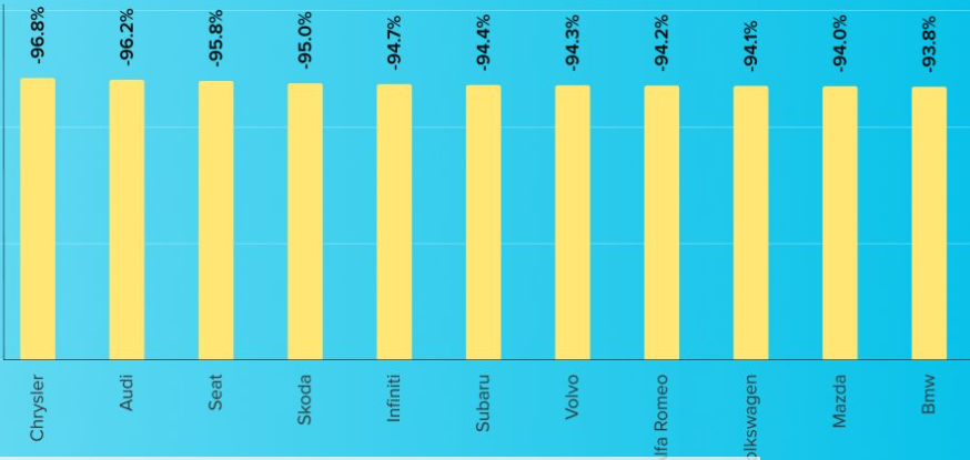 Listenin diğer ucundaysa üzücü bir tablo var. Chrysler, Audi ve Seat, araç sahiplerinin en büyük değer kaybını yaşadığı markalar olarak öne çıkıyor. Örneğin bir Chrysler, ortalama 25 yıl içinde değerinin %96,8’ini kaybediyor. Lüks markalar arasında Infiniti, Volvo ve BMW de yüksek oranda değer yitiriyor.