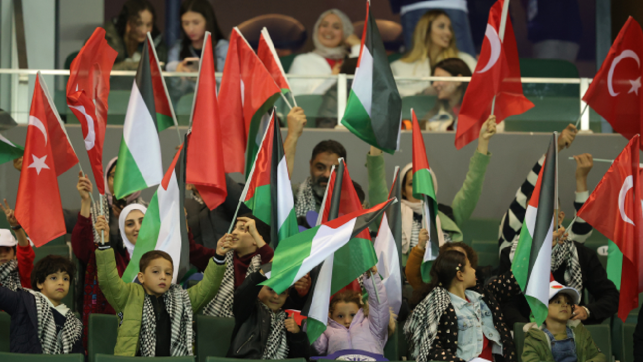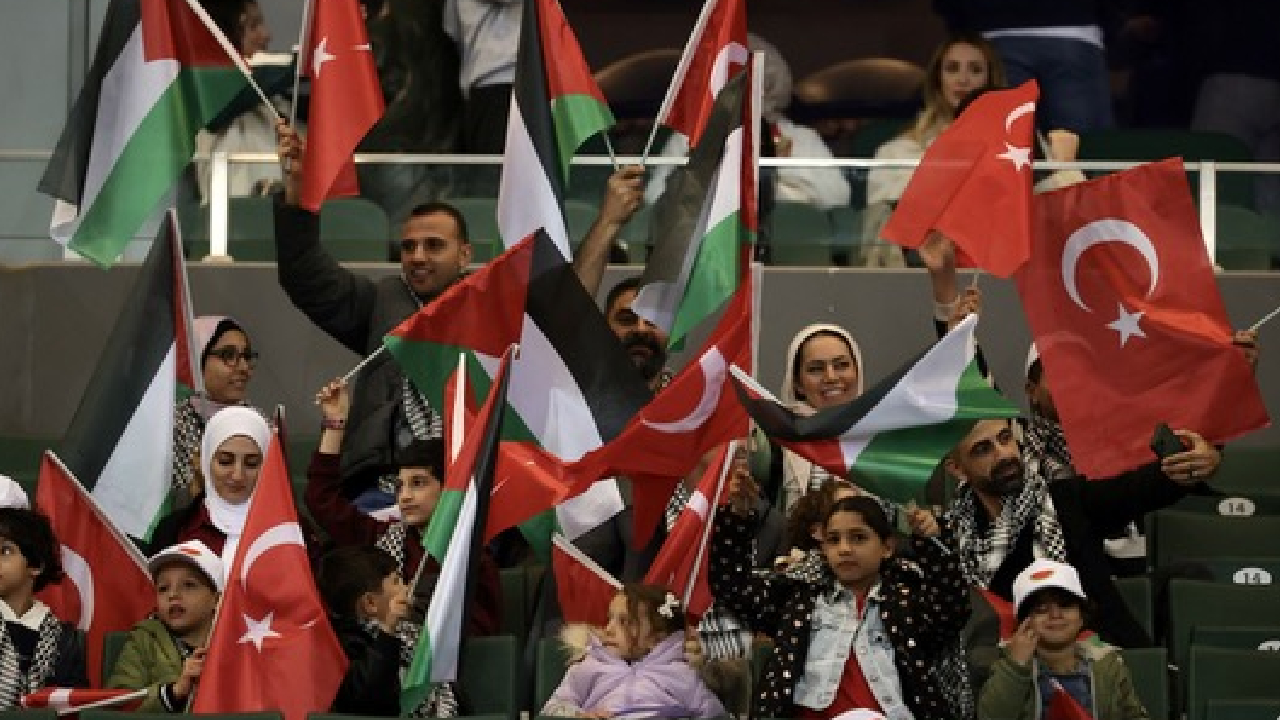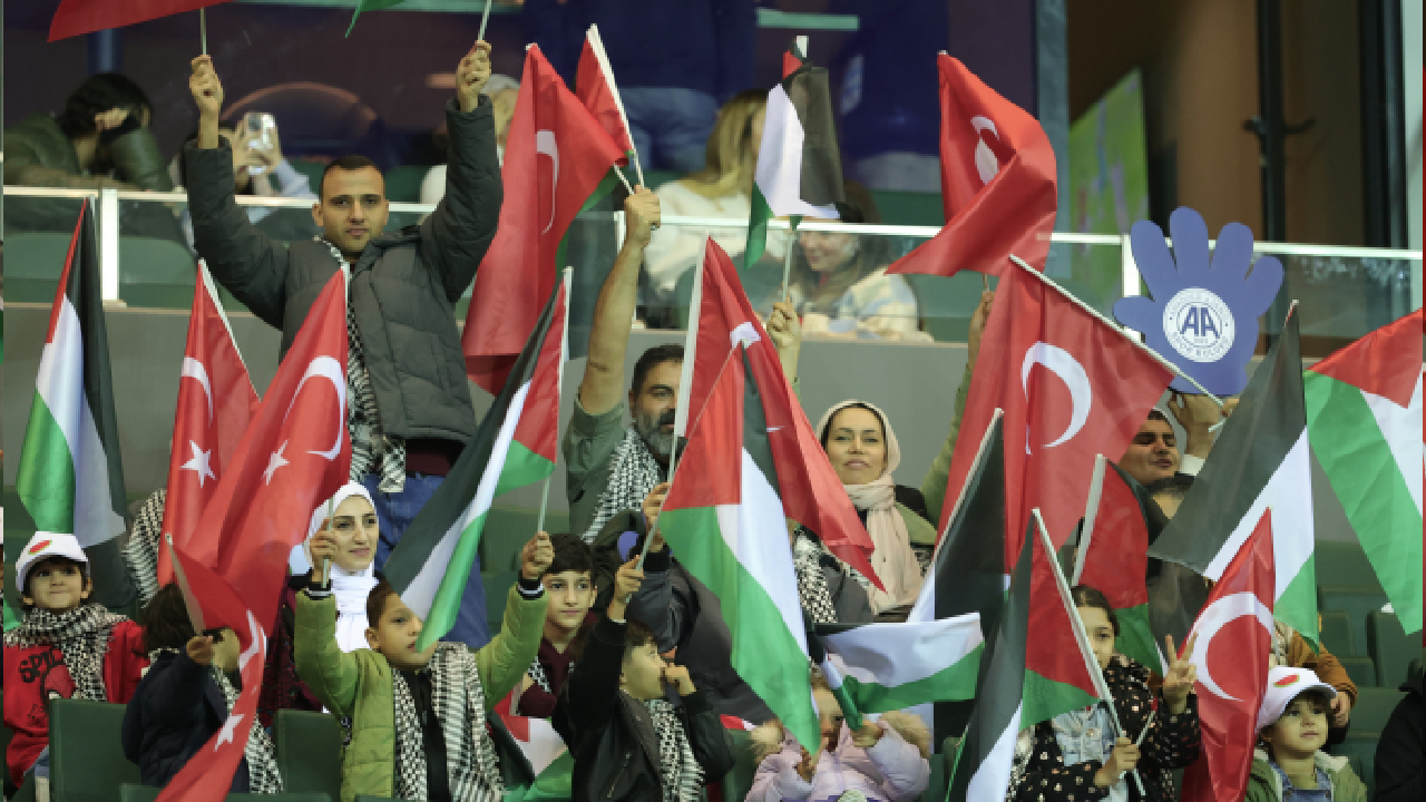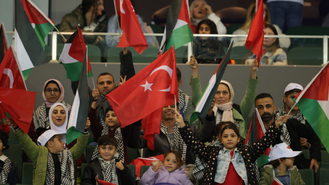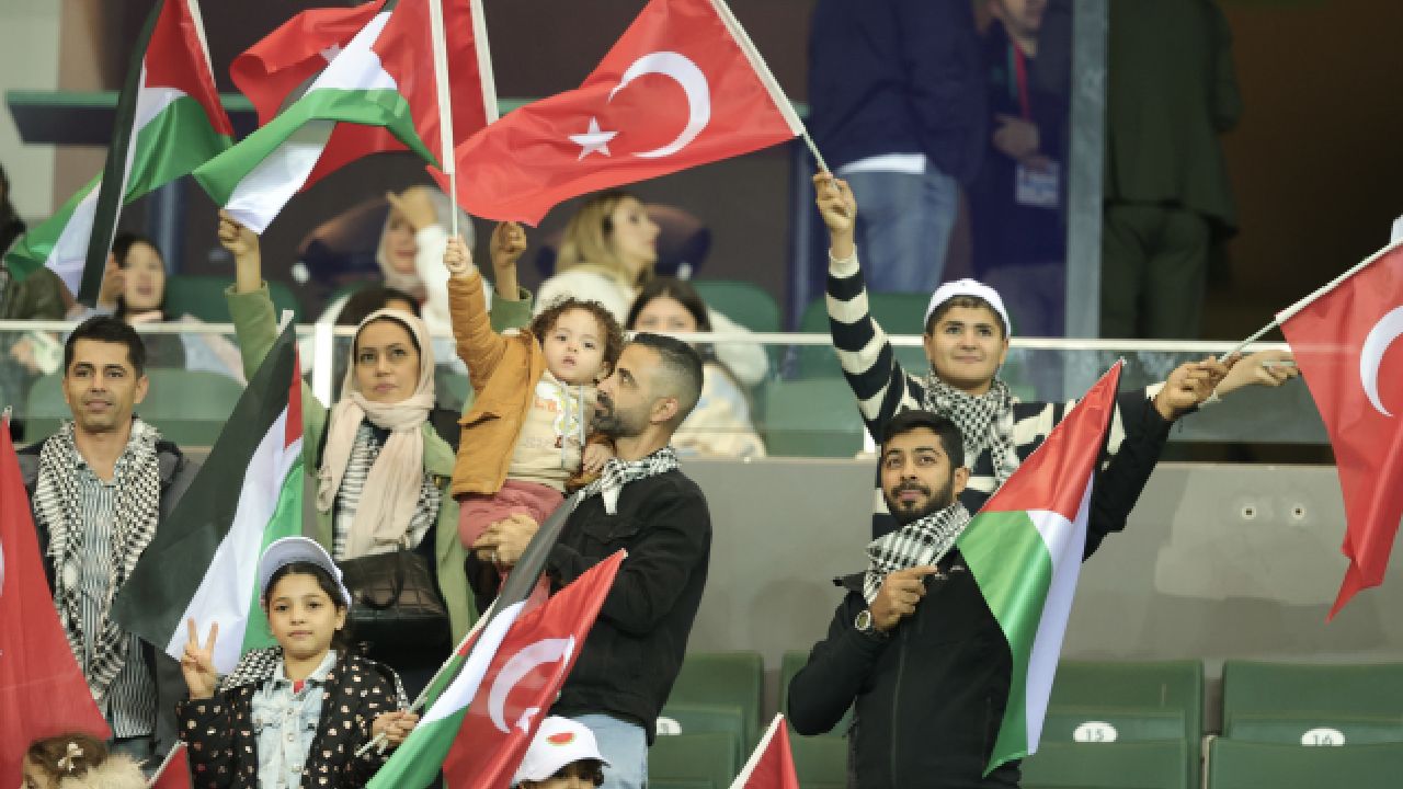 Çok sayıda Filistinli misafir, ellerinde ülkelerinin ve Türkiye bayraklarını sallayarak stadyum atmosferine ortak oldu.