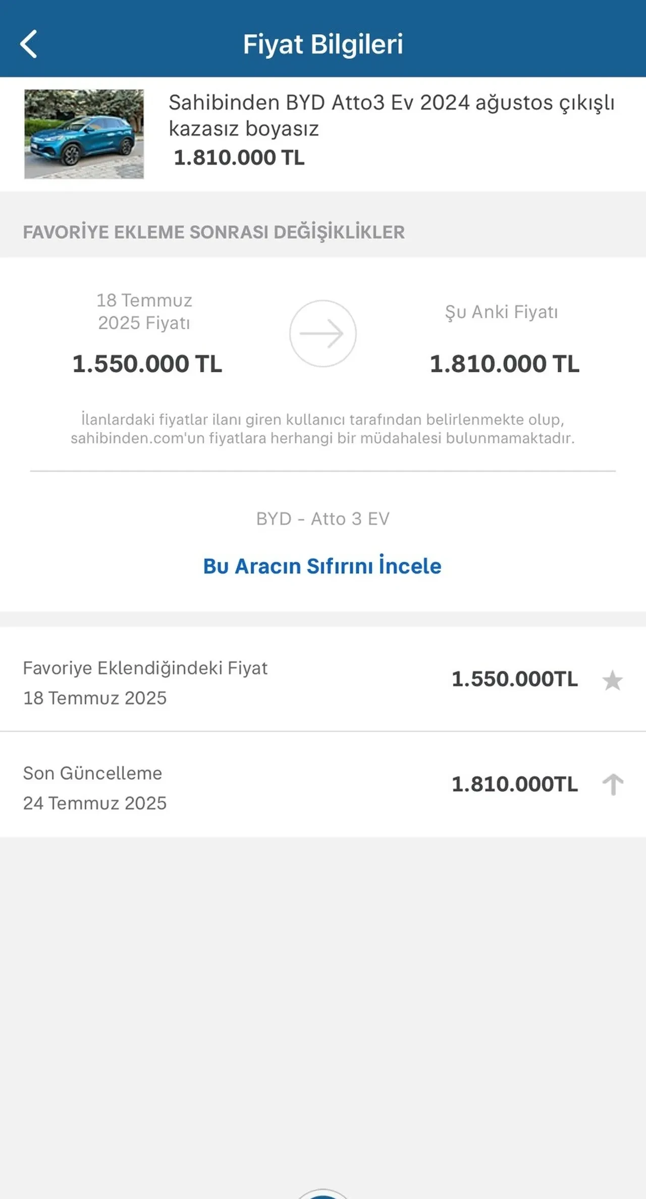 Sosyal medyada infial yaratan ilanlardan biri, kısa süre önce satışa çıkarılan BYD Atto 3 modeline ait. İlanın bir hafta içerisinde yaklaşık 300 bin TL değerinde bir fiyat artışı yaşadığı görülüyor. Uzmanlar, bu tür spekülatif fiyat değişimlerinin ikinci el otomobil piyasasını olumsuz etkilediğine dikkat çekiyor.