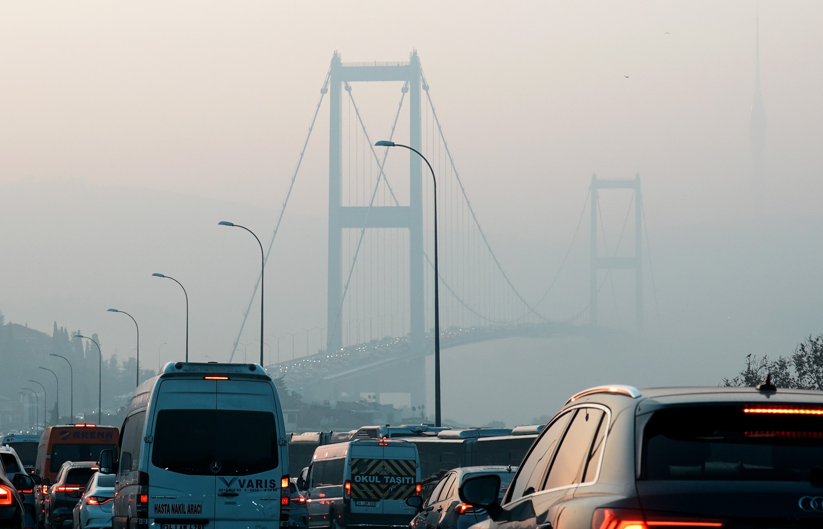 İstanbul Boğazı çevresi ve 15 Temmuz Şehitler Köprüsü’nün bazı bölümleri yoğun sis nedeniyle görünmez oldu. Sürücüler, farlarını açarak kontrollü bir şekilde köprüden geçmek zorunda kaldı.