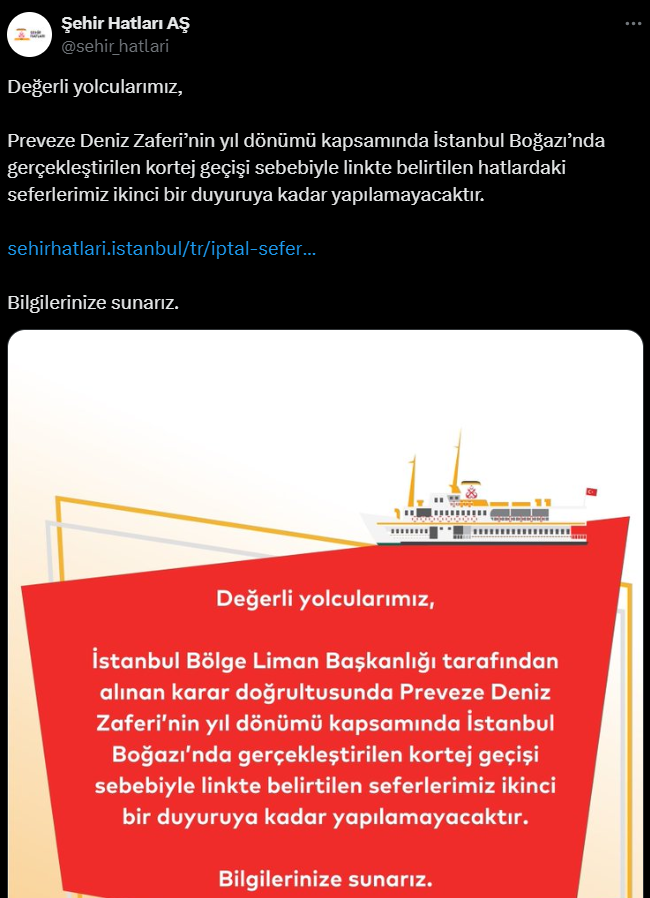 İstanbul Büyükşehir Belediyesi’nin iştiraki olan Şehir Hatları, Preveze Deniz Zaferi’nin yıl dönümü kapsamında düzenlenen etkinlikler sebebiyle bazı hatlarda seferlerin yapılamayacağını duyurdu. Kararın, İstanbul Bölge Liman Başkanlığı tarafından alınan talimat üzerine uygulamaya geçtiği belirtildi.