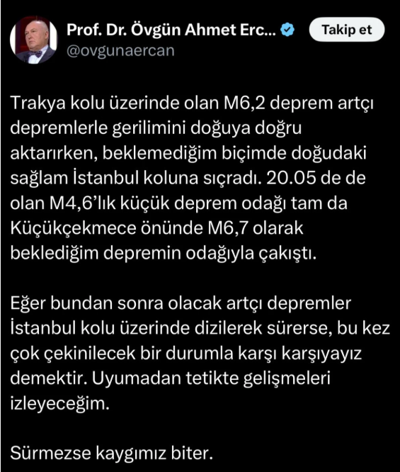 Eğer bundan sonra olacak artçı depremler İstanbul kolu üzerinde dizilerek sürerse, bu kez çok çekinilecek bir durumla karşı karşıyayız demektir. Uyumadan tetikte gelişmeleri izleyeceğim. Sürmezse kaygımız biter.