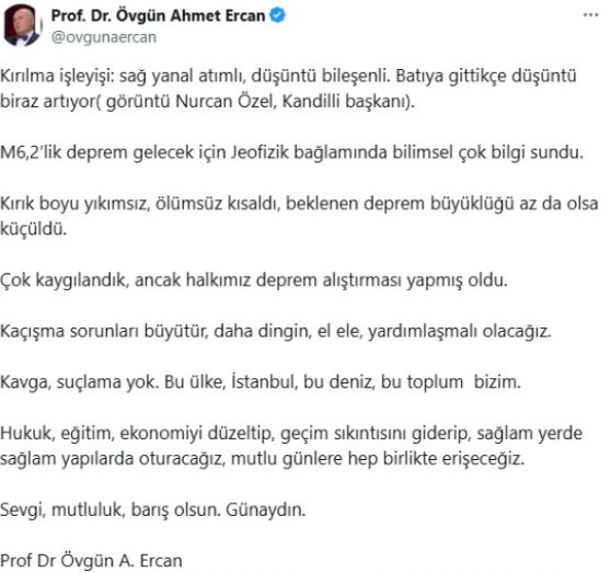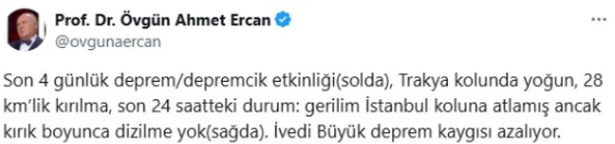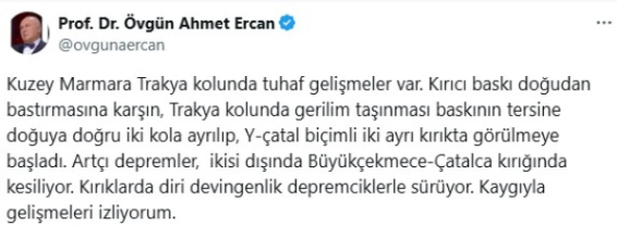 Ercan’ın paylaşımı 5 milyona yakın görüntülenerek büyük yankı uyandırırken, saatler ilerledikçe uzman isim yeni veriler ışığında tehlikenin büyük oranda düştüğünü ifade etti. Yine de Marmara fay hattının dikkatle izlenmesi gerektiğini vurguladı.
