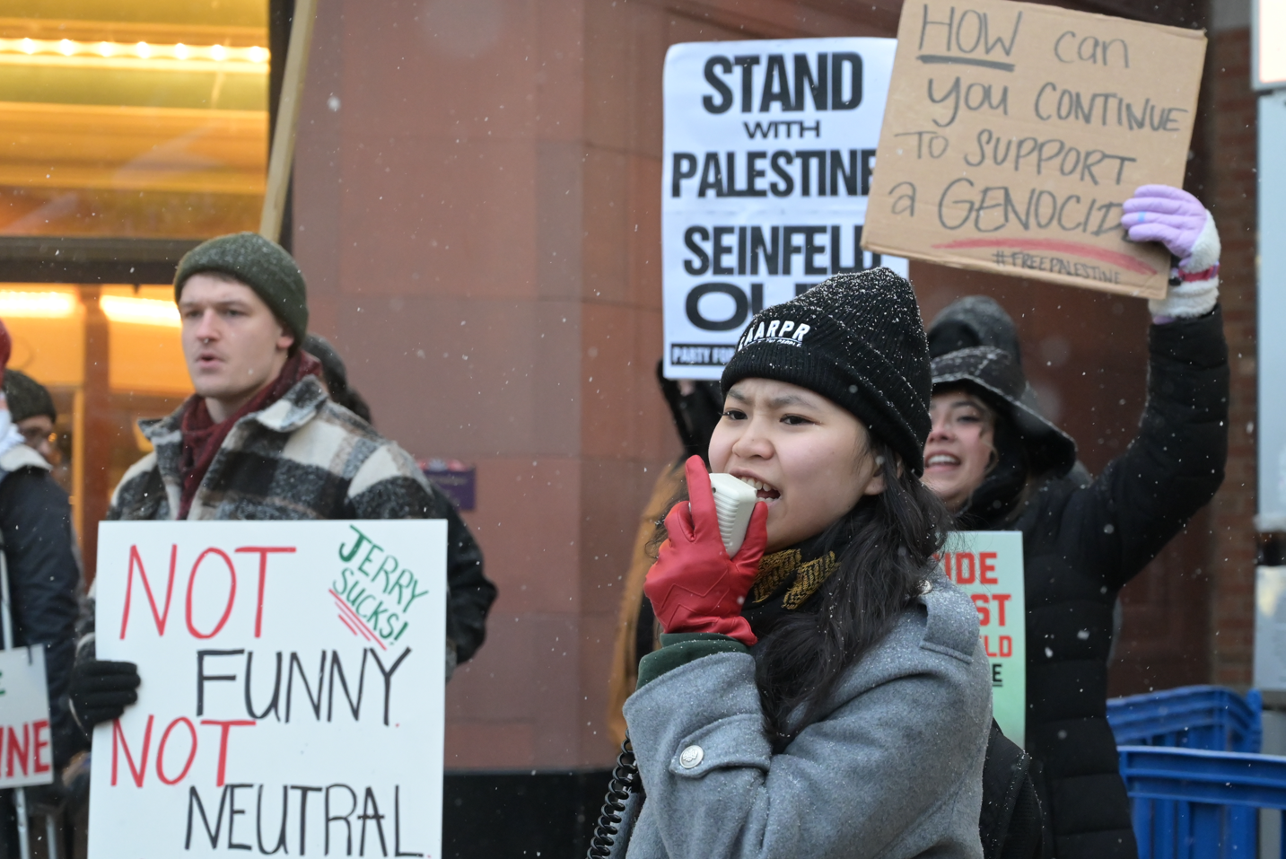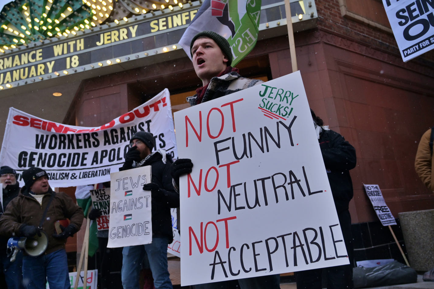 Gösteri öncesinde tiyatro önünde toplanan protestocular, Seinfeld’in Gazze’de yaşanan çatışmalara ilişkin tutumunu eleştirerek komedyenin boykot edilmesi çağrısında bulundu.