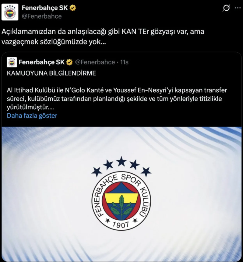 Fenerbahçe, N’Golo Kanté transferini resmi sosyal medya hesaplarından da duyurdu. Kulüp tarafından yapılan paylaşımda, “Açıklamamızdan da anlaşılacağı gibi KAN, TER, gözyaşı var ama vazgeçmek sözlüğümüzde yok...” ifadelerine yer verildi. Bu açıklamayla birlikte uzun süredir gündemde olan transfer dosyası kapanmış oldu.