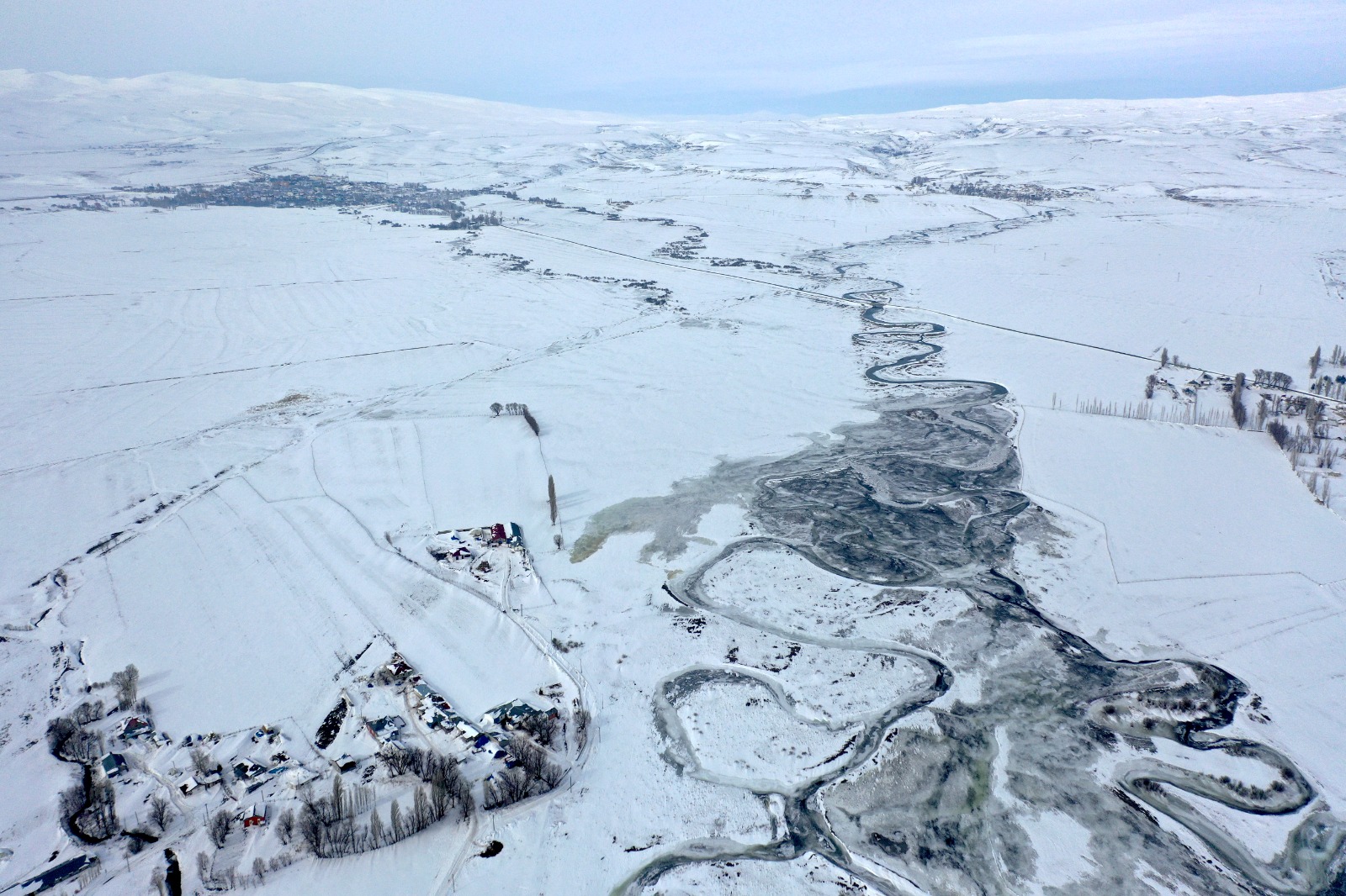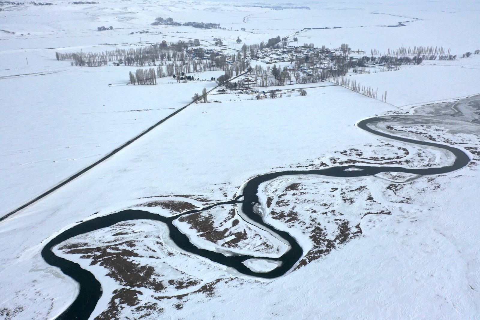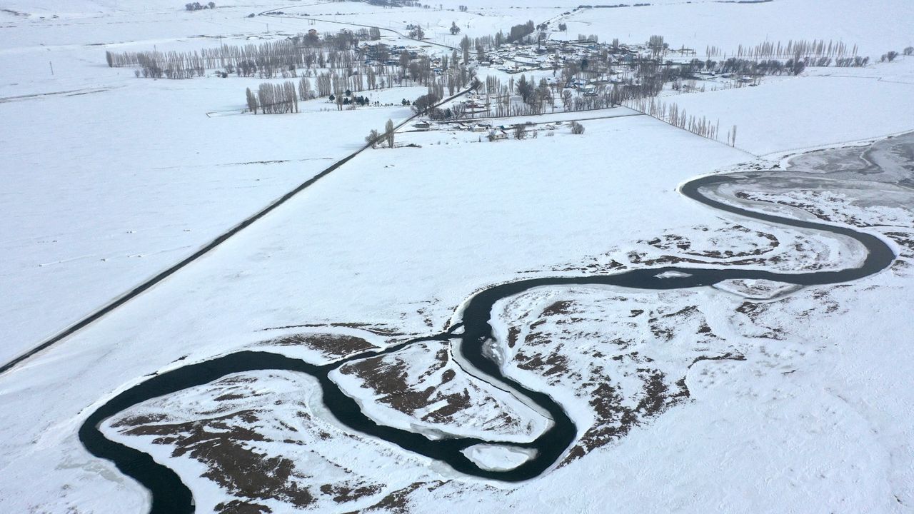 Kars’ta günlerdir etkisini sürdüren yoğun kar yağışı, doğayı adeta beyaz bir örtüyle kapladı. Özellikle Arpaçay ilçesine bağlı köylerde kar kalınlığının yer yer 1 metreyi aşmasıyla birlikte ortaya çıkan manzara, havadan görüntülendi. Karla kaplanan köyler ve kıvrıla kıvrıla uzanan menderesler, bölgeye görsel bir şölen sundu.