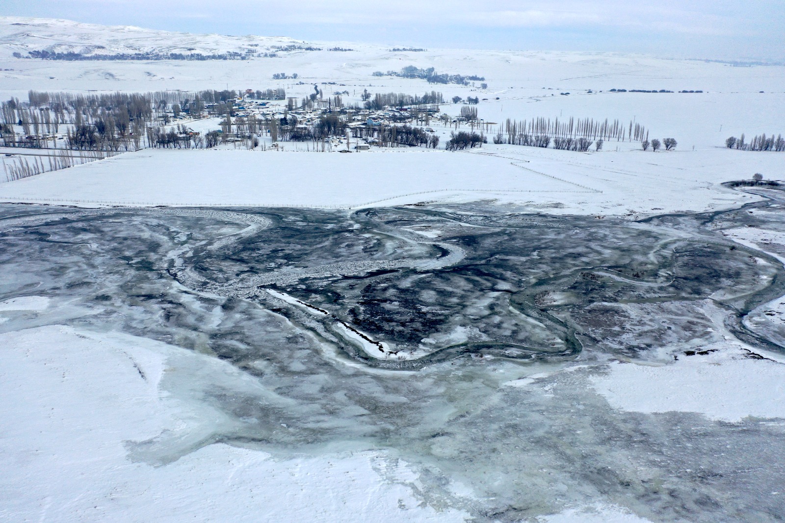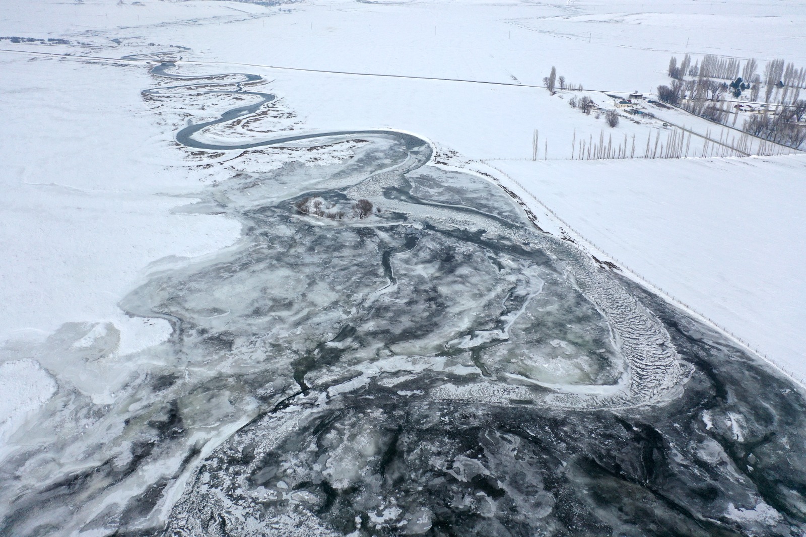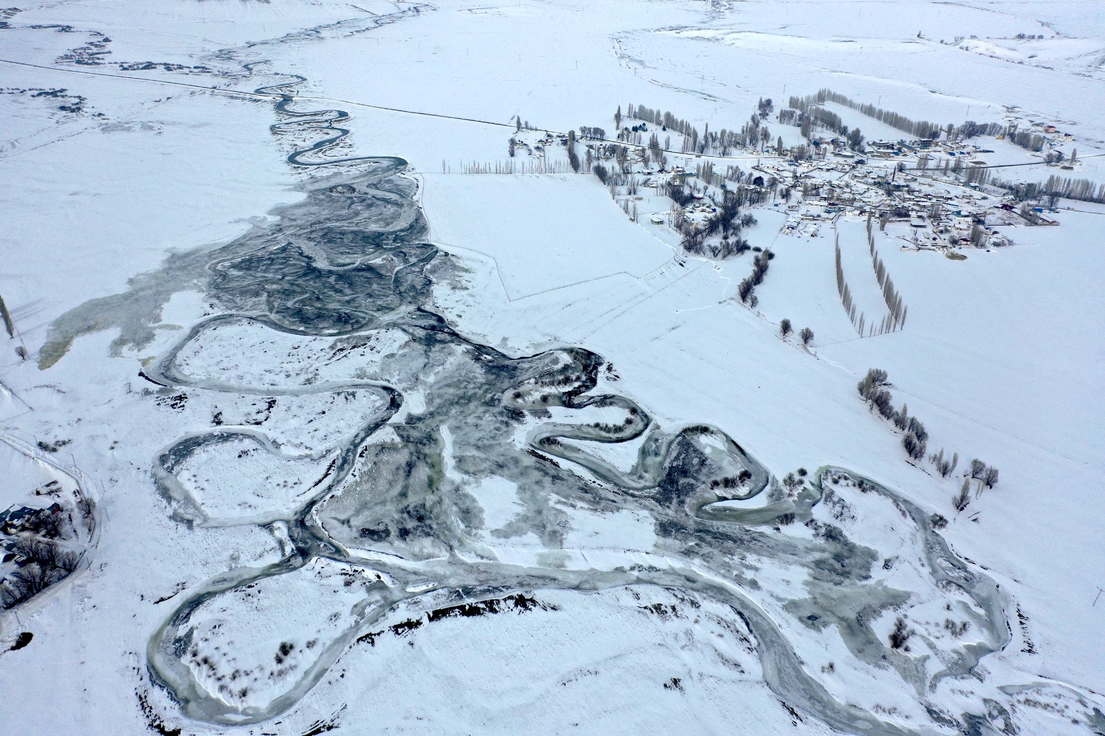 Soğuk havanın etkisiyle akarsuların bazı bölümlerinin donduğu görüldü. Karla kaplanan mendereslerin oluşturduğu kıvrımlı yapı, dronla havadan görüntülenerek Kars’ın kış manzarasını gözler önüne serdi. Ortaya çıkan görüntüler, kartpostalları aratmadı.