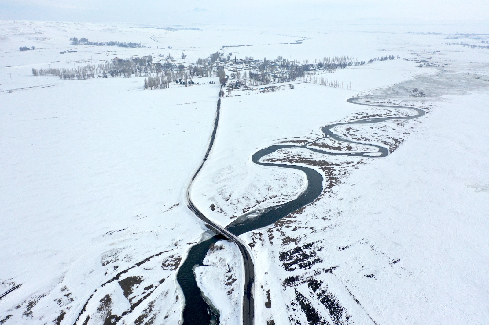 Arpaçay ilçesine bağlı Okçuoğlu ve Tepecik köyleri yoğun kar yağışıyla tamamen beyaza bürünürken, iki köy arasından geçen menderesler de karla kaplandı. Kışın sert yüzünü gösterdiği bölgede, karla birlikte doğa adeta sessizliğe gömüldü.