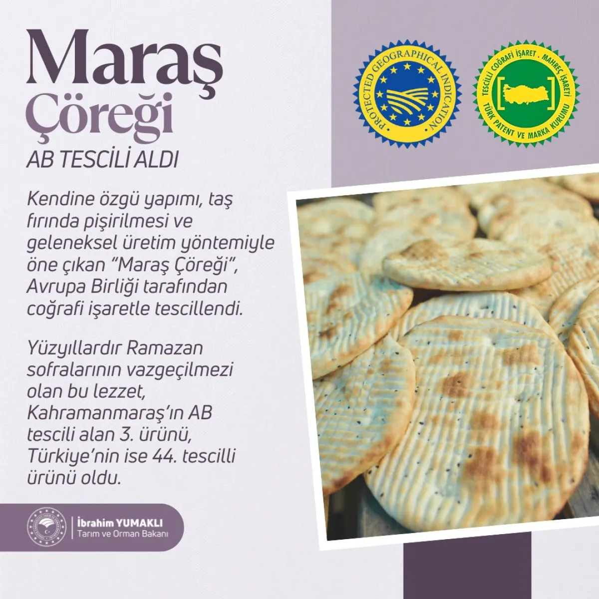 Tarım ve Orman Bakanı İbrahim Yumaklı, yayımladığı mesajda Avrupa Birliği’nden coğrafi tescilli ürün sayısının 44’e yükseldiğini bildirdi. Bakan Yumaklı, sosyal medya hesabından yaptığı paylaşımda, “KAHRAMANMARAŞ'IN LEZZETLERİ SINIRLARI AŞIYOR” başlığını kullanarak kentin geleneksel ürünlerinin yurt dışında da tanınmaya devam ettiğini ifade etti. Bakan, “Maraş çöreği, Çağlayancerit cevizi ve Maraş tarhanasından sonra AB tarafından tescillenen bir başka Kahramanmaraş lezzeti oldu. Böylelikle AB'den tescilli ürün sayımız 44'e yükseldi.” cümlelerine yer verdi.