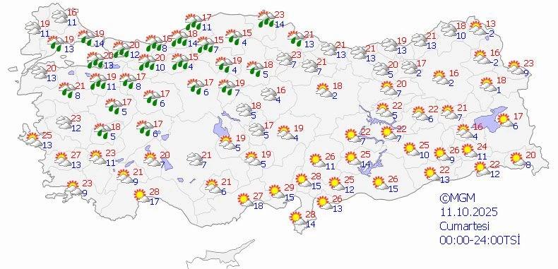 Marmara (Edirne ve Çanakkale hariç), Batı Karadeniz, Doğu Karadeniz kıyıları ve Eskişehir ile Ordu çevreleri yağmur ve sağanak yağışlı; bazı yerlerde gök gürültülü sağanak öngörülüyor. Diğer bölgeler ise az bulutlu ve açık geçecek.