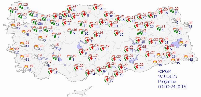 Meteoroloji Genel Müdürlüğü’nün son tahminlerine göre Türkiye genelinde parçalı ve çok bulutlu bir hava bekleniyor. Marmara, Ege, Akdeniz, İç Anadolu, Karadeniz, Doğu ve Güneydoğu Anadolu’nun batısında sağanak ve yer yer gök gürültülü sağanak yağışlar görülecek.