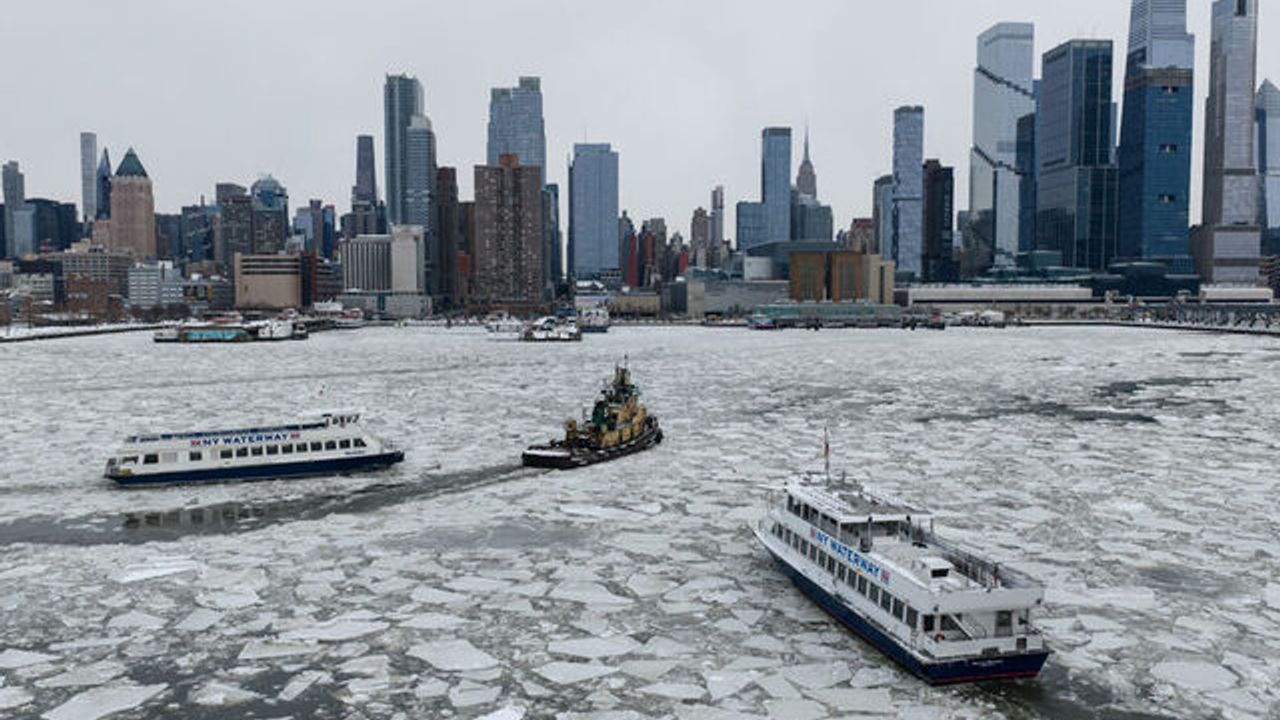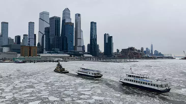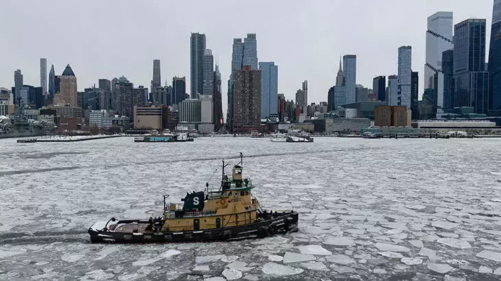 New York’ta etkili olan dondurucu soğukların ardından Hudson Nehri’nin bazı kesimlerinde buz tabakaları oluştu. Nehir yüzeyindeki buz kütleleri havadan da net şekilde görüntülendi.
