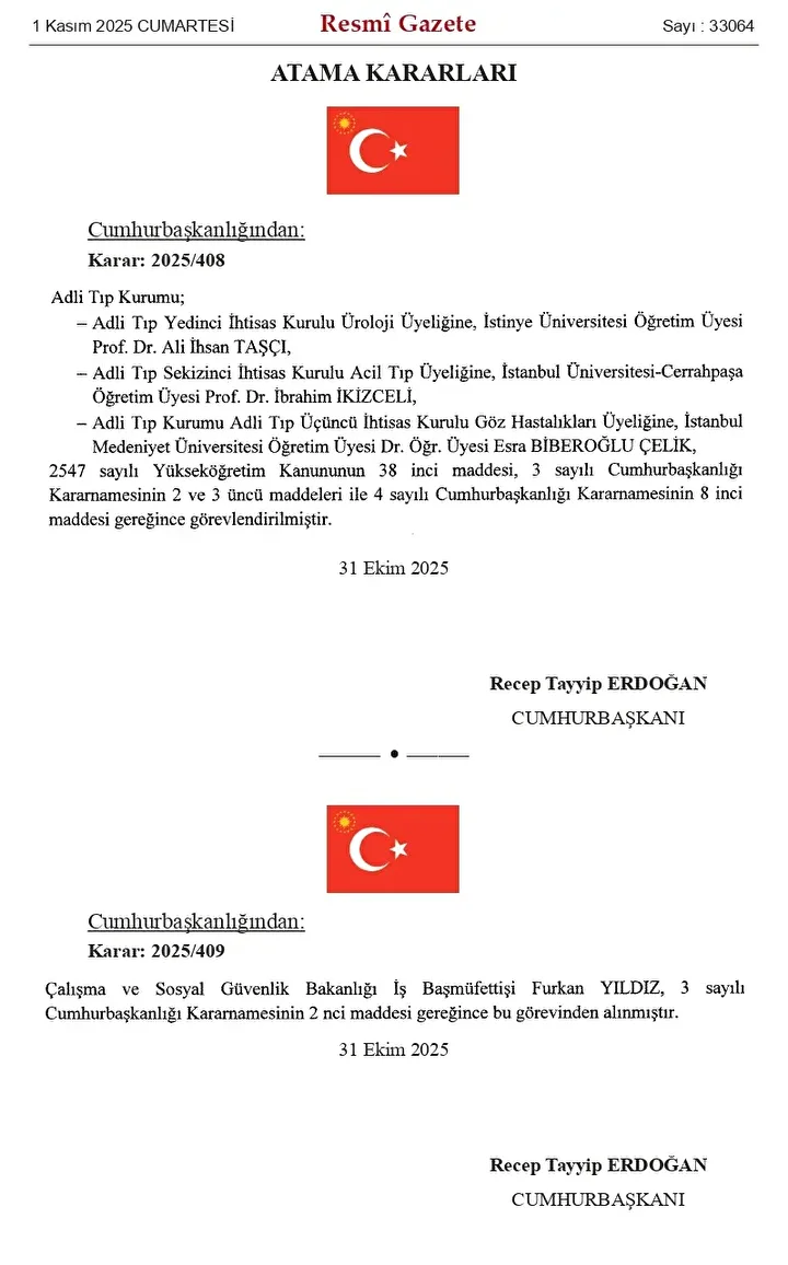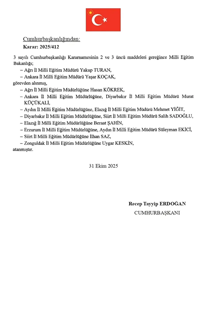 Cumhurbaşkanı Recep Tayyip Erdoğan imzasını taşıyan 1 Kasım 2025 tarihli Resmi Gazete ile sekiz ilin il milli eğitim müdürü görevden alındı ve yeni atamalar gerçekleştirildi. Ankara İl Milli Eğitim Müdürlüğüne Murat Küçükali atandı. DEĞİŞİKLİK YAPILAN İLLERDE GÖREV DEĞİŞİKLİKLERİ Söz konusu atama kararlarına göre, görevden alınan ve yeni atanan müdürler listesi yayımlandı.