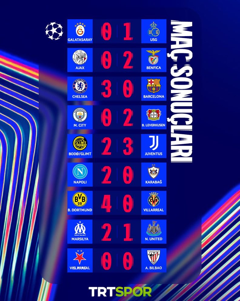 UEFA Şampiyonlar Ligi’nde 5. hafta karşılaşmaları başladı. Saat 20.45 seansında başlayan mücadelelerde Galatasaray, sahasında konuk ettiği Belçika temsilcisi Union Saint-Gilloise’a 1-0 mağlup oldu. Gecenin bir diğer dikkat çeken mücadelesinde ise Jose Mourinho’nun çalıştırdığı Benfica, Ajax deplasmanında sezonun ilk galibiyetini aldı. Avrupa genelinde nefes kesen 9 maç oynanırken hem sürpriz sonuçlar hem de kritik puan kayıpları yaşandı.