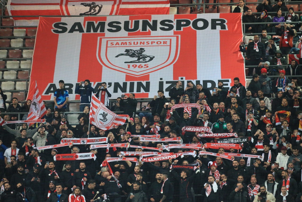 Polonya deplasmanında takımlarını yalnız bırakmayan Samsunspor taraftarları, tribünleri kırmızı-beyaz renklere boyayarak 90 dakika boyunca destek verdi.