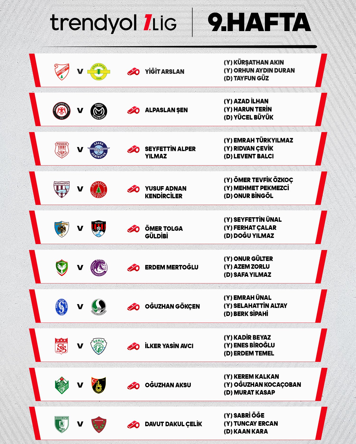 Trendyol 1. Lig'de 9. haftanın hakemleri şu şekilde.