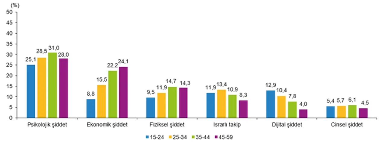 15-24 yaş grubundaki kadınlar, son 12 ayda hem psikolojik hem dijital şiddete daha fazla maruz kalıyor. Yaş ilerledikçe risk düşüyor.