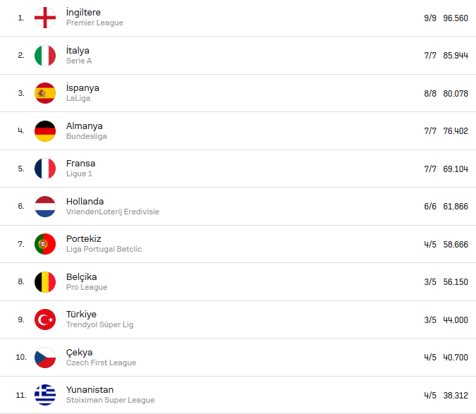 UEFA ülke puanı sıralamasında İngiltere, İtalya ve İspanya zirvedeki yerini korudu. Almanya ve Fransa da ilk 5 içinde yer alıyor.