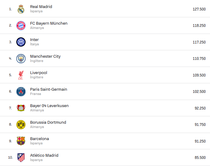 Real Madrid zirvede. Bayern Münih, Inter, Manchester City ve Liverpool ilk 5’te. PSG ise 6. sırada yer aldı.