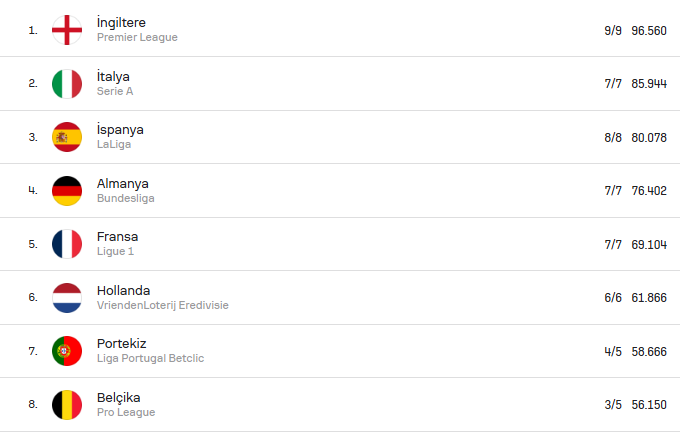 Trendyol Süper Lig, 44.000 puanla 9. sırada bulunuyor. Türkiye’nin önünde Belçika ve Portekiz yer alırken, arkasında Çekya var.
