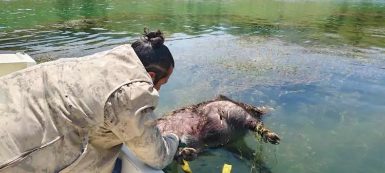 Ekipler, ölü domuzu bacağından halatla bağlayarak kıyıya çekti. İşlem dikkatli şekilde gerçekleştirildi.