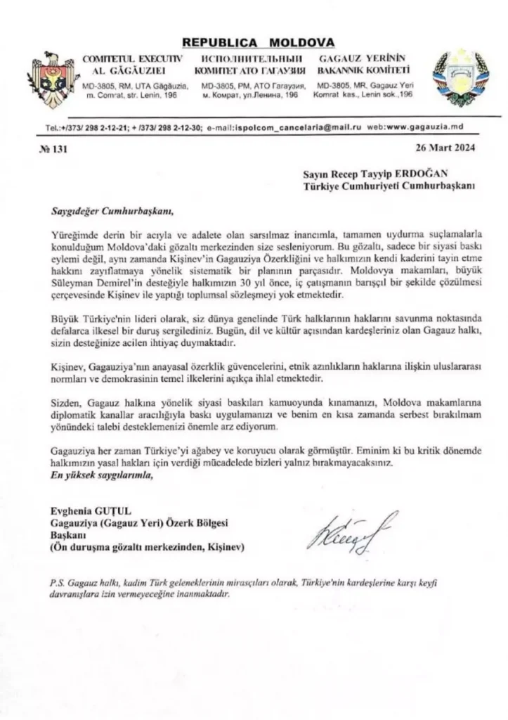 "Büyük Türkiye'nin lideri olarak siz dünya genelinde Türk halklarının haklarını savunma noktasında defalarca ilkesel bir duruş sergilediniz" diyen Gutsul Türkiye Cumhurbaşkanı'na, 30 yıl önce Ankara'nın yardımlarıyla Moldova içinde özerklik varlığına ilişkin bir anlaşmaya varıldığını hatırlattı. Gutsul, Moldova makamlarının Rusya ve Türkiye ile iş birliğini savunan Gagavuzya sakinlerine zulmettiğini dile getirdi: Sayın Cumhurbaşkanı ve tüm kardeş Türk halkının buna duyarsız kalmayacağından eminim. Sesinize, otoritenize, uluslararası desteğinize güveniyoruz.