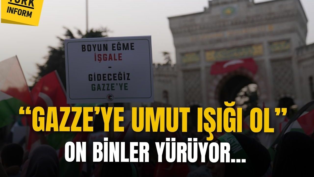 Katılımcılar, “Katil İsrail, Filistin’den defol” ve “Gazzeli çocuklar bizi bekliyor” sloganları atarak yürüyüşe başladı. Cep telefonlarının ışıklarını ve küçük fenerlerini açan vatandaşlar, meydandan Ayasofya-i Kebir Cami-i Şerifi’ne doğru hareket etti.