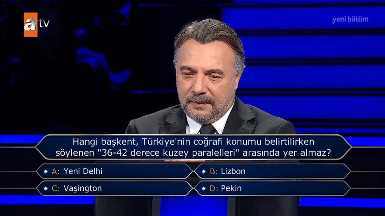 Kim Milyoner Olmak İster yarışmasının yeni bölümünde coğrafya bilgisini ölçen bir soru yöneltildi. Yarışmacıya, Türkiye’nin enlem konumuna dair verilen aralıkta yer almayan bir dünya başkentini seçmesi istendi. Soru, izleyiciler arasında da merak konusu oldu.