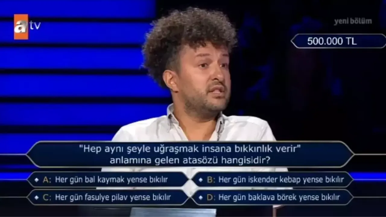 Soruda, “Hep aynı şeyle uğraşmak insana bıkkınlık verir” anlamına gelen atasözünün hangisi olduğu yarışmacıya yöneltildi. Sorunun şıkları arasında halk arasında sıkça duyulan ama birbirine yakın anlamlar içeren ifadeler yer aldı.