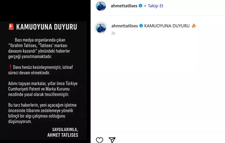 Oğul Tatlıses, sosyal medya hesabından yaptığı açıklamada, “Bazı medya organlarında çıkan İbrahim Tatlıses, ‘Tatlıses’ markası davasını kazandı yönündeki haberler gerçeği yansıtmamaktadır. Dava henüz kesinleşmemiştir, istinaf süreci devam etmektedir” dedi.
