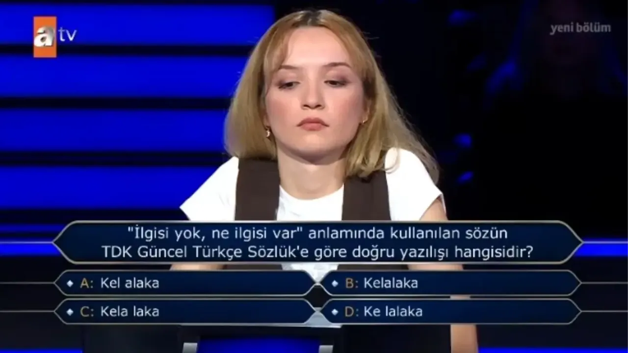 Yarışmacıya yöneltilen, “İlgisi yok, ne ilgisi var anlamında kullanılan sözün TDK Güncel Türkçe Sözlük'e göre yazılışı hangisidir?” sorusu, ekran başındaki birçok izleyiciyi de düşünmeye sevk etti. Haberin Burada’nın haberine göre, sorunun doğru yanıtı “kelalaka” oldu.