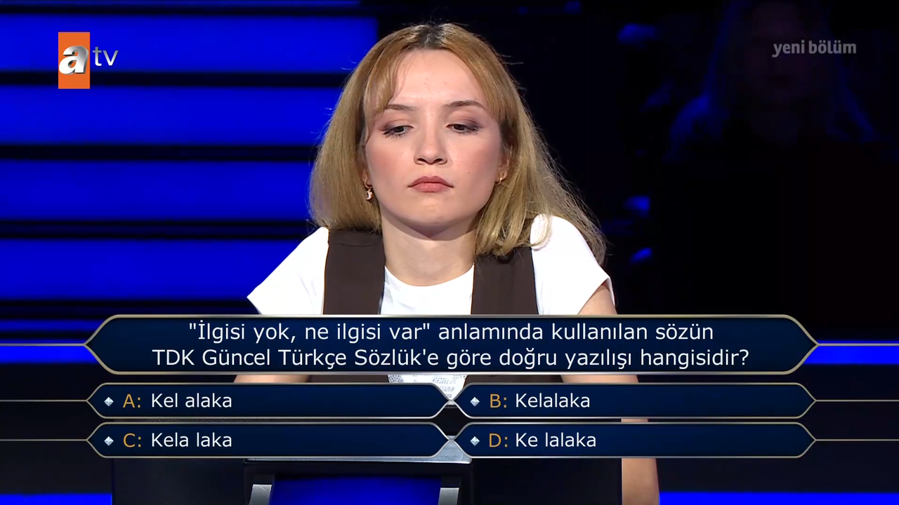 Kim Milyoner Olmak İster yarışmasının son bölümünde yarışmacıya, “İlgisi yok, ne ilgisi var anlamında kullanılan sözün TDK Güncel Türkçe Sözlük'e göre doğru yazılışı hangisidir?” sorusu yöneltildi. Yarışmada sorulan bu ifade, günlük dilde sıkça kullanılan fakat yazımında kafa karışıklığına yol açan bir deyim olarak dikkat çekti. Şıklar ise şu şekildeydi: A: Kel alaka, B: Kelalaka, C: Kela laka, D: Ke lalaka.