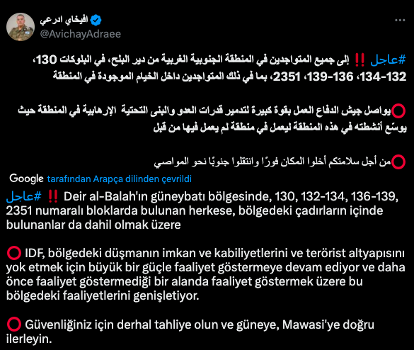 Paylaşılan haritaya göre, Gazze Şeridi'nin orta kesiminde yer alan Deyr el-Belah'ta 130, 132, 133, 134, 135, 136, 137, 138, 139 ve 2351 numaralı blokların derhal boşaltılması gerektiği tehdidinde bulunan Adraee, işaretli bölgelerdeki Filistinlilerden Gazze Şeridi'nin güneyindeki Han Yunus'un Mevasi bölgesine gitmelerini istedi.