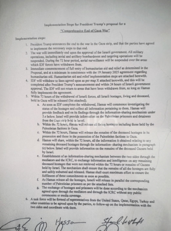 Ateşkesin temelini ABD Başkanı Donald Trump’ın “Gazze Savaşı’nın Kapsamlı Sonu” başlıklı önerisinin uygulama adımları oluşturuyor. Plana göre Trump, Gazze Şeridi’ndeki savaşın sona erdiğini ilan edecek ve tarafların gerekli adımları atmak konusunda mutabakata vardığını açıklayacak. Savaş, İsrail hükümetinin onayıyla hemen sona erecek ve tüm askeri operasyonlar, hava, kara ve topçu bombardımanları dahil, durdurulacak. Yetmiş iki saatlik sürede, İsrail Savunma Kuvvetleri’nin çekildiği bölgelerde hava gözetimi askıya alınacak.