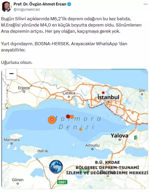 Türkiye’nin önde gelen jeofizik mühendislerinden Prof. Dr. Övgün Ahmet Ercan, sosyal medya hesabı üzerinden yaptığı açıklamada endişeye gerek olmadığını belirtti. Sarsıntının, daha önce yaşanan bir depremin artçısı olduğunu vurgulayan Ercan, “Bugün Silivri açıklarında 6.2’lik depremin ardından batıya doğru, Marmara Ereğlisi yönünde 4.0 büyüklüğünde artçı bir sarsıntı yaşandı. Bu, sönümlenen ana depremin bir devamıdır. Her şey olağan, kaçışmaya gerek yok” sözleriyle vatandaşları rahatlattı.