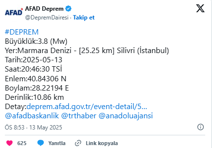 AFAD’ın verilerine göre, İstanbul Silivri açıklarında saat 20.46'da 3,8 büyüklüğünde bir deprem kaydedildi. Depremin derinliği ise 10,86 kilometre olarak belirlendi.