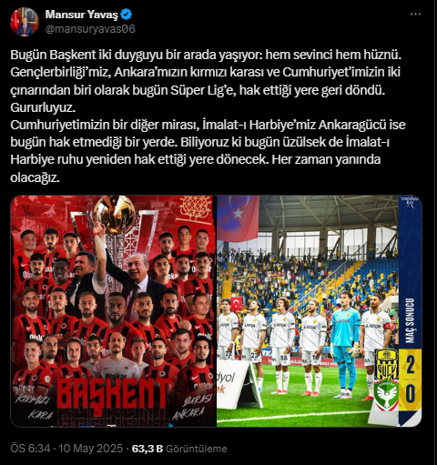 Ankara Büyükşehir Belediye Başkanı Mansur Yavaş, Başkent temsilcisi iki kulübün maçlarından sonra X hesabından dikkat çeken bir paylaşımda bulundu.