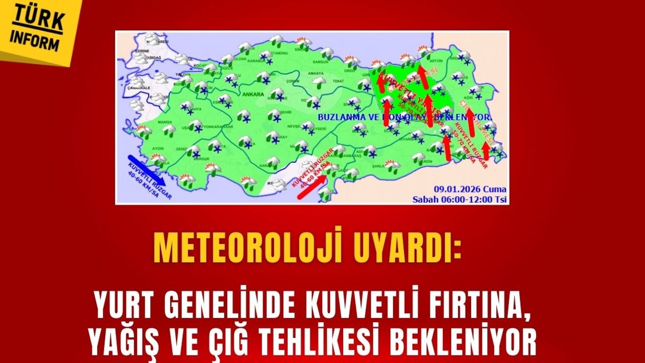 MGM, Doğu Karadeniz, Doğu Anadolu'nun kuzey ve doğusu (Iğdır, Kars, Ağrı, Van ve Ardahan hariç) ile Hatay, Osmaniye ve Ordu çevrelerinde yer yer kuvvetli yağış beklendiğini duyurdu. Bu bölgelerde sel, su baskını ve ulaşım aksaklıklarına karşı tedbirli olunması gerektiği bildirildi. Ayrıca iç ve doğu kesimlerde sabah ve gece saatlerinde buzlanma ve don olayı beklenirken; Doğu Karadeniz'in iç kesimlerinin yüksekleri ile Doğu Anadolu'nun doğusunun yüksek ve eğimli kesimlerinde çığ tehlikesi bulunduğu kaydedildi.