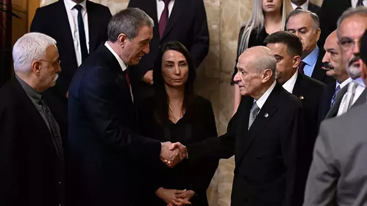 DEM Parti heyetine başsağlığı dileklerini ileten Bahçeli, TBMM Başkanı Kurtulmuş, DEM Parti Eş Genel Başkanı Tuncer Bakırhan, DEM Parti Van Milletvekili Pervin Buldan ve Sırrı Süreyya Önder'in kardeşi Ali Fuat Önder ile bir süre sohbet etti.