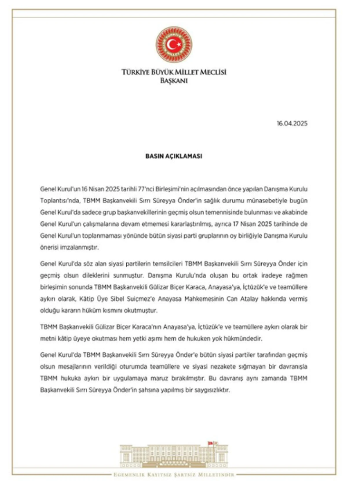 "Genel Kurul’un 16 Nisan 2025 tarihli 77’nci Birleşimi’nin açılmasından önce yapılan Danışma Kurulu Toplantısı’nda, TBMM Başkanvekili Sırrı Süreyya Önder’in sağlık durumu münasebetiyle bugün Genel Kurul’da sadece grup başkanvekillerinin geçmiş olsun temennisinde bulunması ve akabinde Genel Kurul’un çalışmalarına devam etmemesi kararlaştırılmış, ayrıca 17 Nisan 2025 tarihinde de Genel Kurul’un toplanmaması yönünde bütün siyasi parti gruplarının oy birliğiyle Danışma Kurulu önerisi imzalanmıştır.