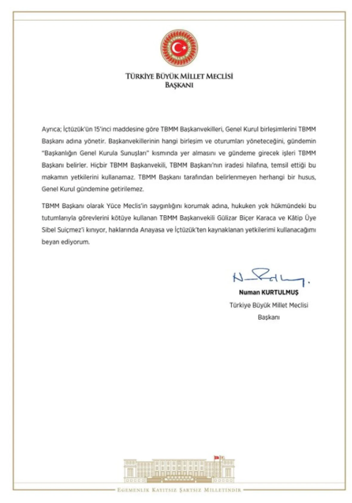 "TBMM Başkanı olarak Yüce Meclis’in saygınlığını korumak adına, hukuken yok hükmündeki bu tutumlarıyla görevlerini kötüye kullanan TBMM Başkanvekili Gülizar Biçer Karaca ve Kâtip Üye Sibel Suiçmez’i kınıyor, haklarında Anayasa ve İçtüzük’ten kaynaklanan yetkilerimi kullanacağımı beyan ediyorum."
