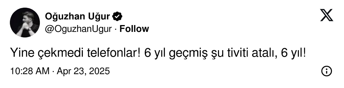 Ünlü isim Oğuzhan Uğur, GSM operatörlerinin ihmalkârlığına dikkat çekti. Uğur, 26 Eylül 2019’da Silivri açıklarında yaşanan 5,8 büyüklüğündeki deprem sonrası attığı tweete atıfta bulundu. 2019’daki paylaşımında, “#deprem bu defa raftan kitap düşürdü… İlk olarak telefona sarılıyorsun tabii. Herkes iyi mi duymak istiyorsun. Hat yok! Kimseye ulaşamıyoruz. ‘Hazırız’ diyorlar… Değilsiniz! Deprem bizi sallıyor ama siz depremi pek sallamıyorsunuz galiba…” ifadelerine yer vermişti. Uğur, bu tweete vurgu yaparak operatörlerin yıllardır süregelen sorunlarına tepki gösterdi.