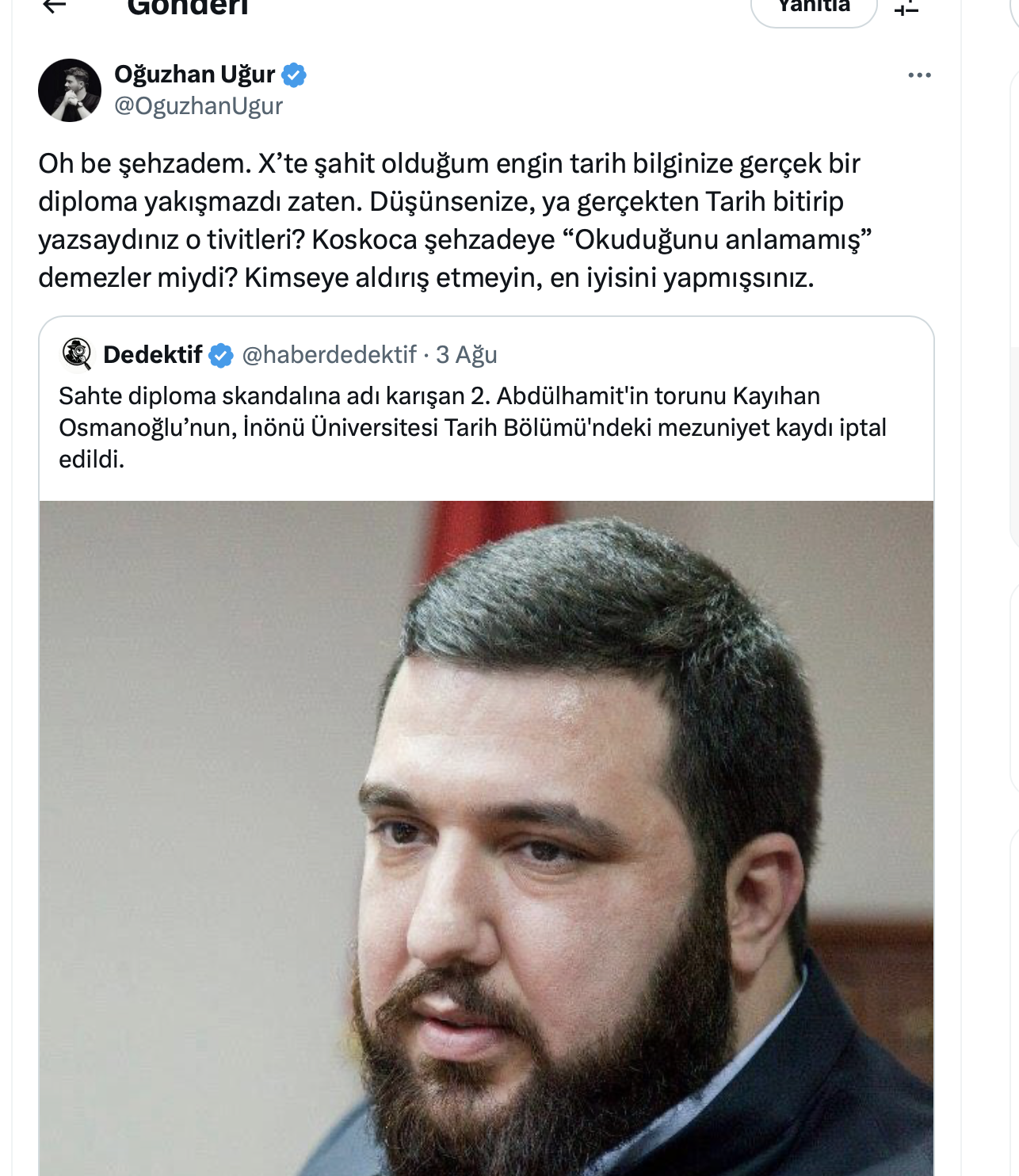 İnönü Üniversitesi Tarih Bölümü’ne ait olduğu iddia edilen diplomanın iptal edilmesiyle patlak veren kriz, YÖK denetçileri tarafından tescillenmişti. Osmanoğlu’nun diploma bilgilerini sisteme işletebilmek için sahte evrak hazırladığı iddiası yargıya taşınmış, soruşturma sürüyor. Oğuzhan Uğur’un çıkışı, tam da bu “sahte asalet” tartışmalarının alevlendiği döneme denk geldi. Sosyal medyada gündem olan alaycı paylaşım sonrası kamuoyu, Osmanoğlu’nun “vakti geldiğinde konuşacağım” diyerek duyurduğu açıklamayı bekliyor.