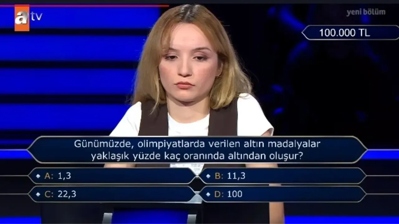 Kim Milyoner Olmak İster yarışmasının son bölümünde sporseverlerin dikkatini çeken bir soru gündeme geldi. Yarışmacıya yöneltilen “Günümüzde, olimpiyatlarda verilen altın madalyalar yaklaşık yüzde kaç oranında altından oluşur?” sorusu, hem yarışmacıyı hem izleyicileri düşündürdü. Haberin Burada’nın haberine göre, doğru cevap oldukça şaşırtıcıydı: Sadece yüzde 1,3!