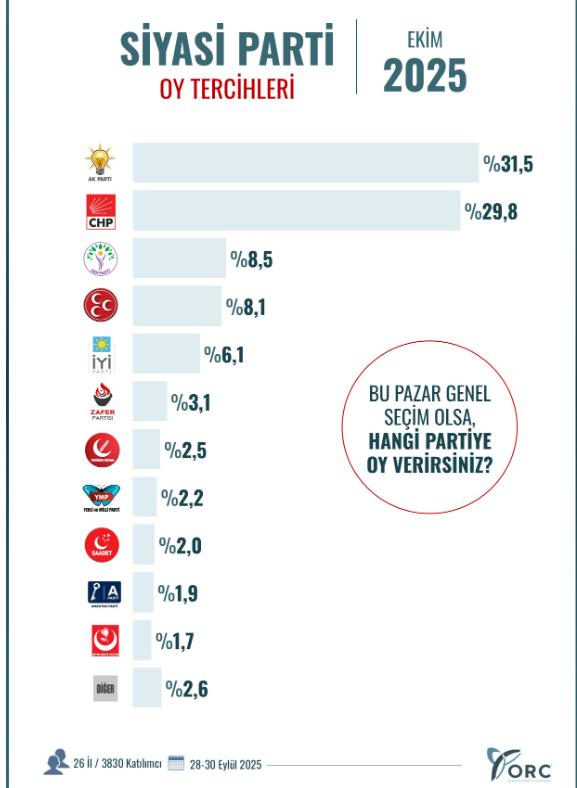 ORC’nin açıkladığı verilere göre araştırma, 28-30 Eylül 2025 tarihleri arasında yapıldı. Katılımcıların tercihlerine göre oluşturulan sonuçlar, ekim ayı siyasi tabloyu yansıttı.