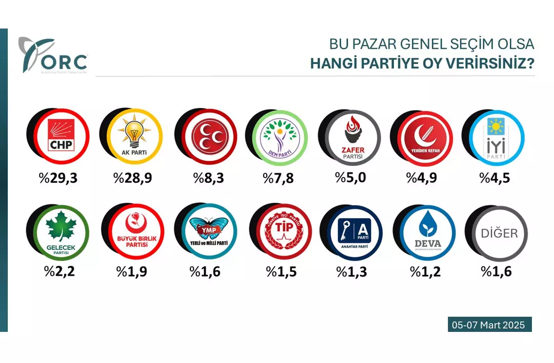 Son anket verilerine göre, CHP yüzde 29,3 oy oranı ile birinci parti konumuna yükseldi. AK Parti ise yüzde 28,9 ile ikinci sırada yer aldı. Aralarındaki fark yalnızca 0,4 puan olurken, her iki partinin de yüzde 30 barajını aşamaması dikkat çekti.Diğer Partilerin Oy Oranları Nasıl?